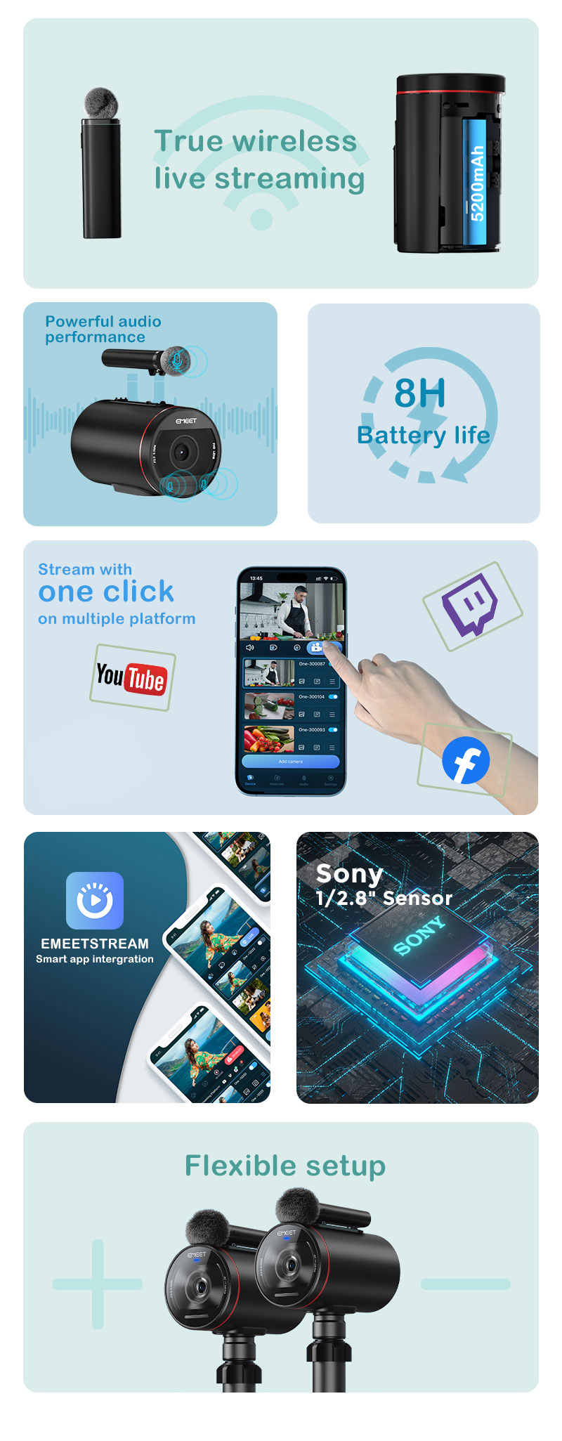 The product is equipped with a long-lasting 8-hour built-in battery, allowing you to start streaming anytime and anywhere.