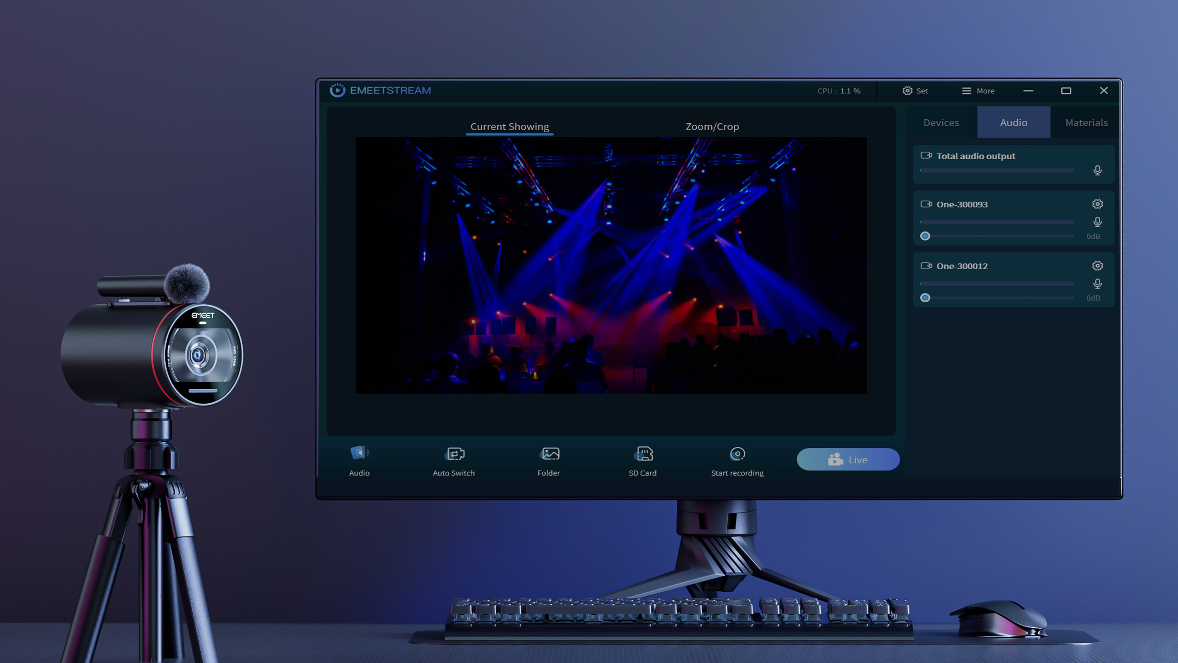 Our free EMEETSTREAM app supports one-click streaming, AI directing, customizable editing, and more.