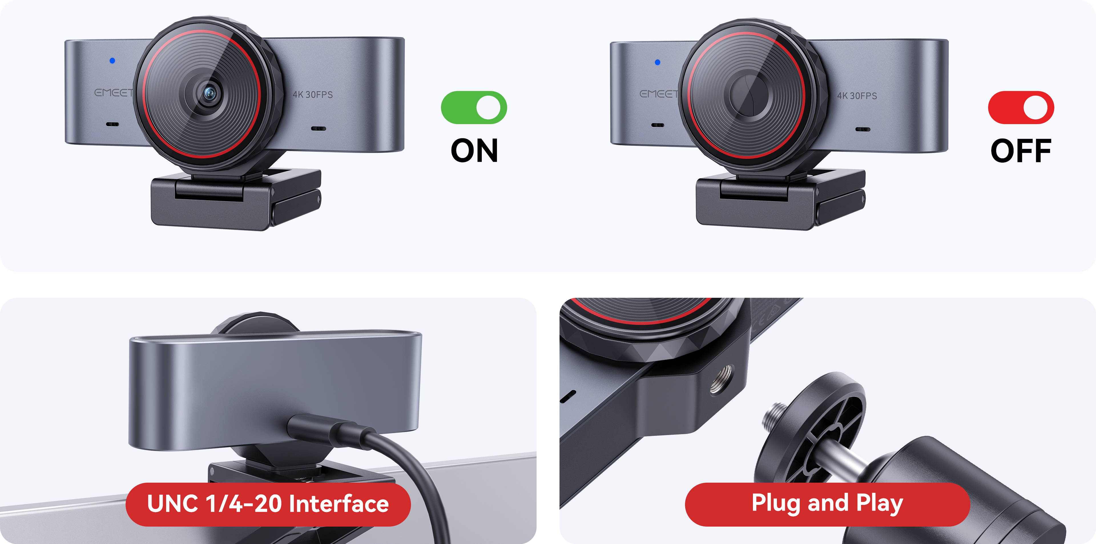Use the built-in clip to securely attach the camera to the top of your monitor or laptop screen. - Tripod Mount