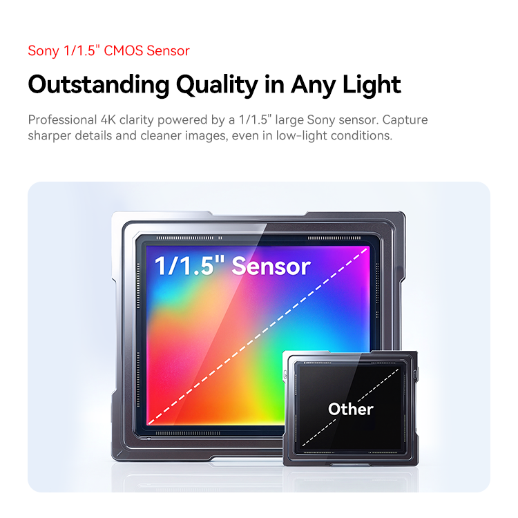 Professional 4K clarity powered by a 1/1.5" large Sony sensor. Capture sharper details and cleaner images, even in low-light conditions.