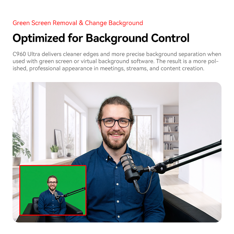 C960 Ultra delivers cleaner edges and more precise backgroundd separation when used with green screen or virtual background software. Thhe result is a more pol ished, professional appearance in meetings, streams, and content creation.