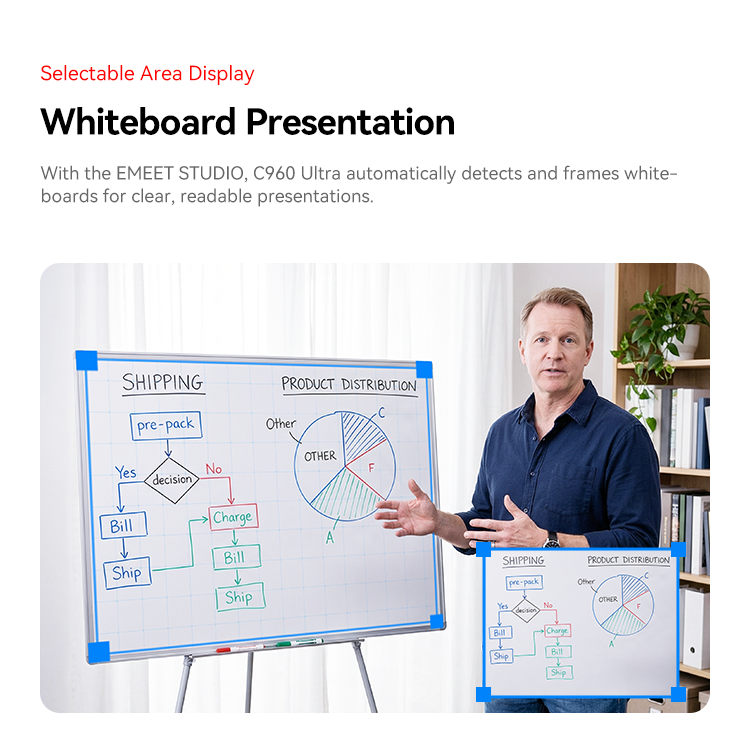With the EMEET STUDIO, C960 Ultra automatically detects and frames whiteboards for clear, readable presentations.